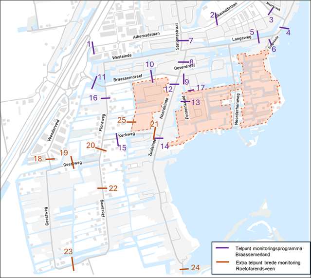 Naast de telpunten van het monitoringsprogramma Braassemerland (paars) wordt er ook gemeten voor de brede monitoring van Roelofarendsveen (oranje). Onder andere voor het project Verkeersveilig Noord- en Zuideinde.